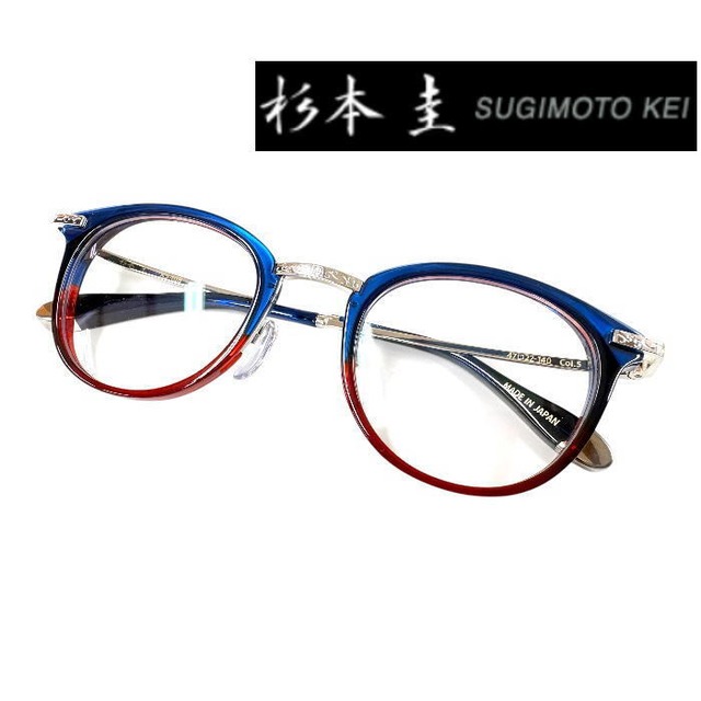 杉本圭(SUGIMOTO KEI) 品番:KS-108 C.5 ネイビーワイン Size フレーム横幅:145mm レンズ横幅:47mm(フレーム部分除く) レンズ縦幅:40mm(フレーム部分除く) ブリッジ幅:22mm テンプル長:140mm *デフォルトで耳に掛ける部分を曲げた状態 Material フレーム素材:セルロイド、βチタン 専用ケース、セリート カラー: 5(ネイビーワイン) MADE IN JAPAN 8mm厚のオリジナルアセテート生地をフロントに用い、アクセントにメタルパーツを使ったコンビネーションフレームです。シェイプは普遍的なボストンタイプ。年齢・性別を問わずに選んで頂けるデザインにしました。テンプルにはβチタンを採用し適度なバネ性を持たせ、モダン小口部・バチ先の飾りにも統一感のあるプレス模様を入れました。 オリジナル「板バネパッド」を搭載したKS-108は、スタイリッシュに決まるだけでなく、掛け心地面でも満足の行く仕上がりです。